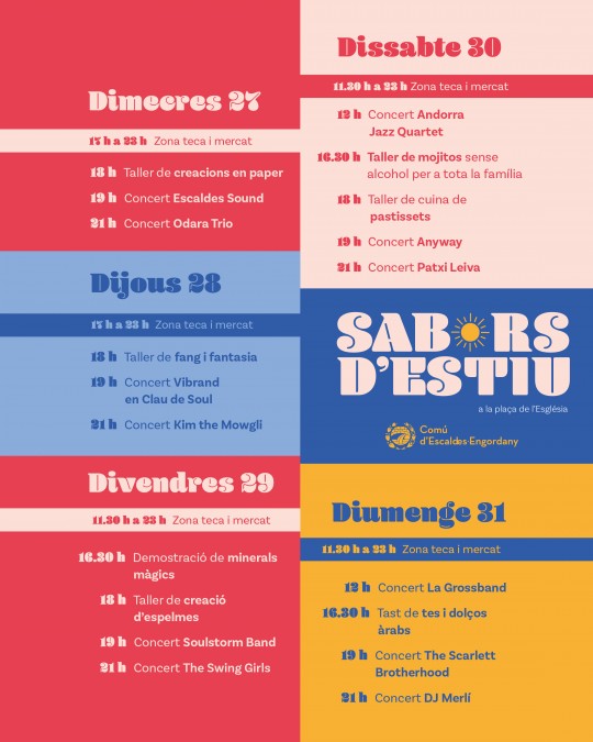 La plaça de l’església d’Escaldes-Engordany tornarà a ser l’epicentre de la sisena edició de Sabors d’Estiu del 27 al 31 d’agost. Després de la remodelació de l’espai, es recupera l’escenari habitual d’aquest esdeveniment cultural i gastronòmic, que el Comú organitza amb la voluntat de dinamitzar la part alta de la parròquia i omplir-la de vida i activitat durant les tardes i vespres d’estiu.