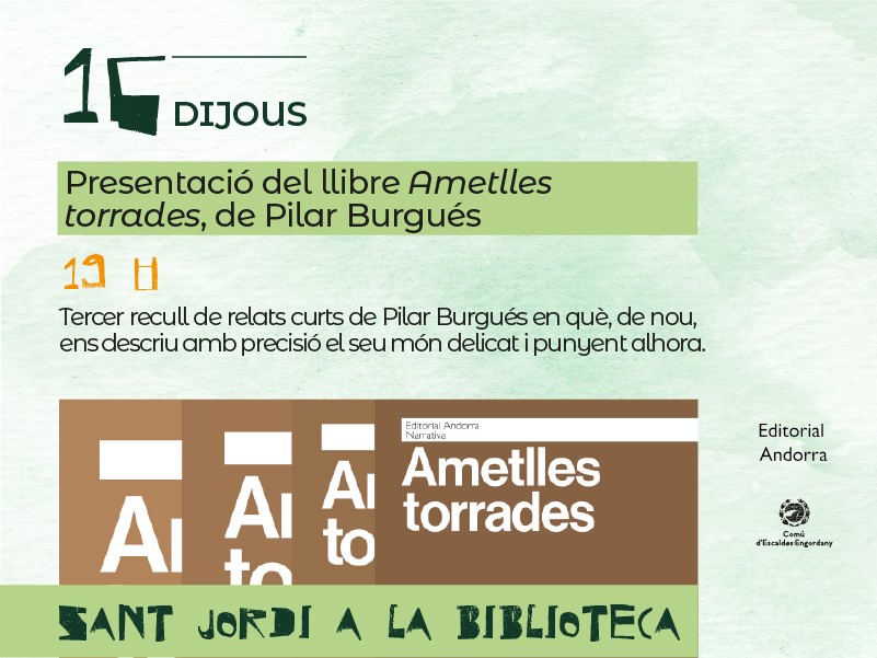 Us convidem a la presentació de la novel·la de l'escriptor Pilar Burgués Ametlles torrades, el tercer recull de relats curts de Pilar Burgués en què, de nou, ens descriu amb precisió el seu món delicat i punyent alhora."