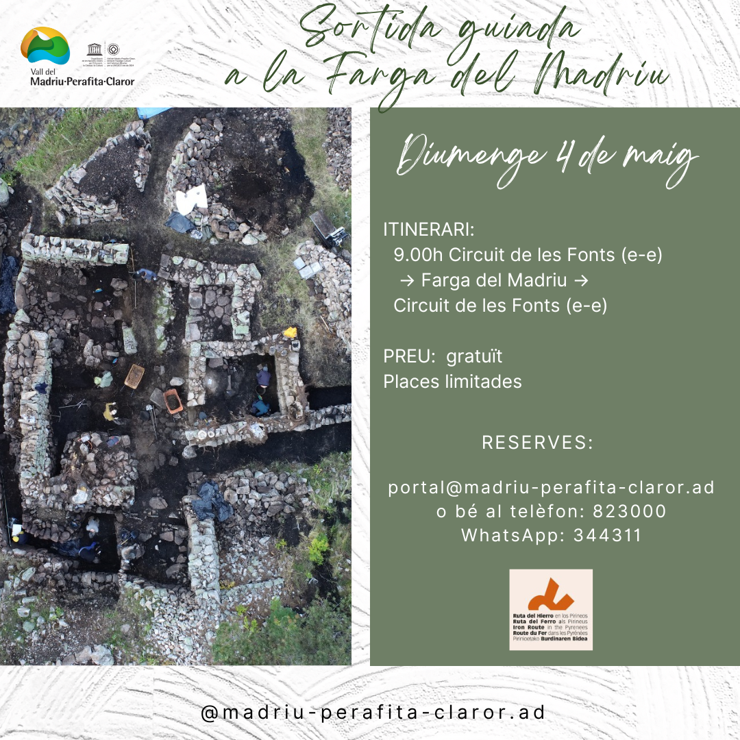 Amb motiu de la commemoració del tercer aniversari de la Diada de la Ruta al Ferro als Pirineus, us convidem a una sortida guiada per l'itinerari siderúrgic de la Vall del Madriu que inclou el Circuit d'Interpretació de la Farga del Madriu, a Escaldes-Engordany.