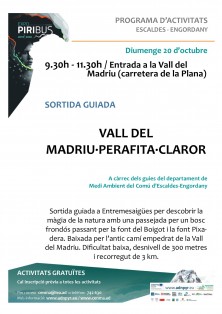 Sortida guiada a Entremesaigües per descobrir la màgia de la natura amb una passejada per un bosc frondós passant per la font del Boigot i la font Pixadera. Baixada per l’antic camí empedrat de la Vall del Madriu. Dificultat baixa, desnivell de 300 metres i recorregut de 3 km.