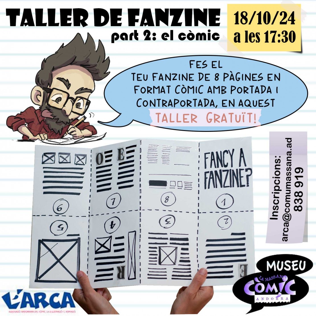 Taller de còmic, a càrrec de l'il·lustrador Marc Huguet, on es realitzarà un fanzine de 8 pàgines amb portada i contraportada.