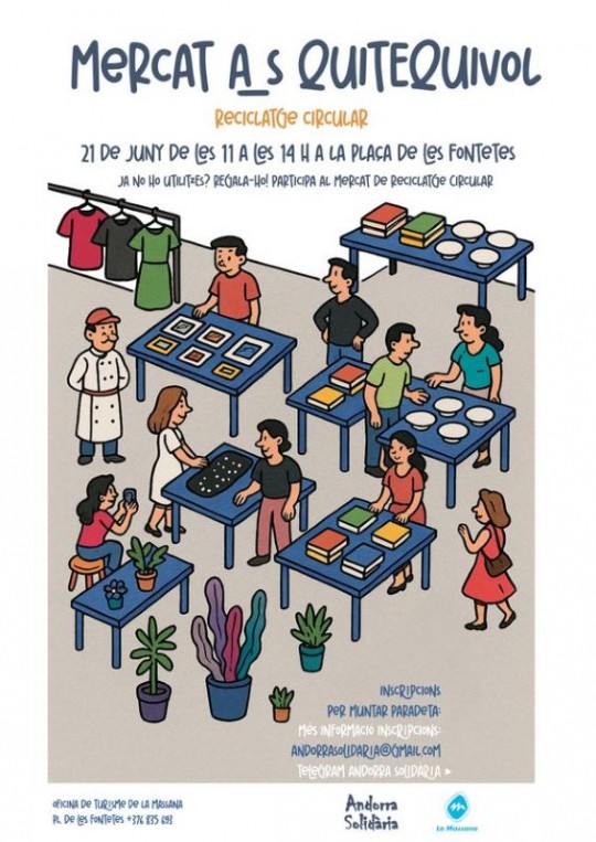 El 21 de juny, de les 11 h a les 14 h, la plaça de les Fontetes de la Massana acollirà una nova edició del Mercat Andorra Solidària, un esdeveniment pensat per fomentar la solidaritat, la reutilització i el consum responsable. Tot el que trobareu al mercat és gratuït!