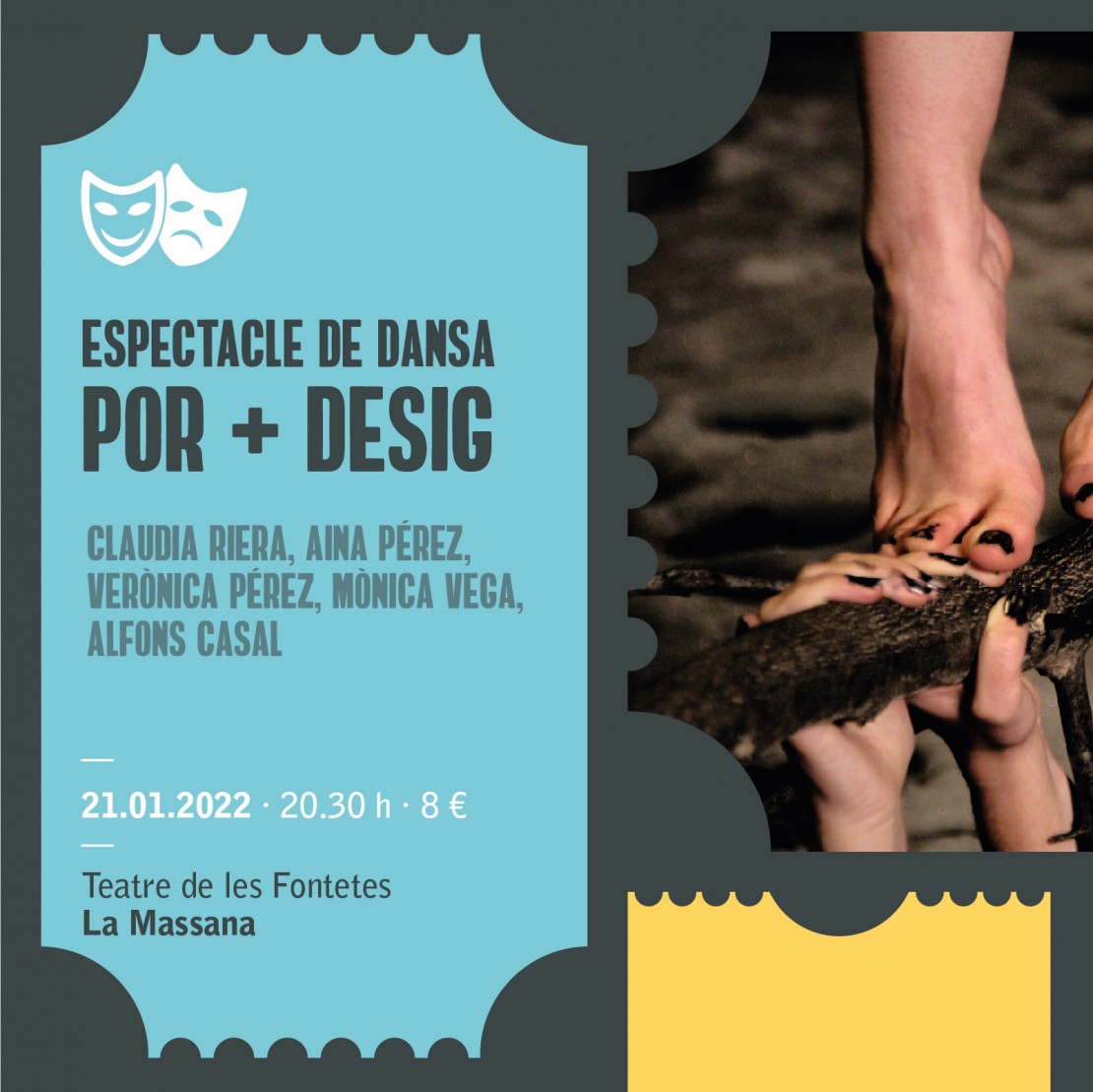 Espectacle de dansa. Por + desig és un espectacle en què es combinen dos elements que poden semblar antagònics a simple vista, però que esdevenen complementaris. Combinant la dansa, el moviment, el gest i el text, l’espectacle proposa una exploració i una immersió al voltant de dos conceptes que associem com a contraris. Què és la por? I el desig? I què els uneix?