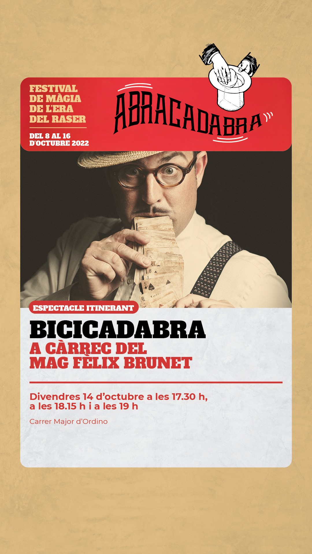 Bicicadabra, a càrrec del mag Fèlix Brunet. Bicicadabra és un espectacle itinerant de màgia, mim i humor gestual. Mister F, un personatge singular i divertit, anirà fent màgia a totes les persones que es trobi pels carrers d’Ordino, tot conduint un tricicle amb música Dixieland.