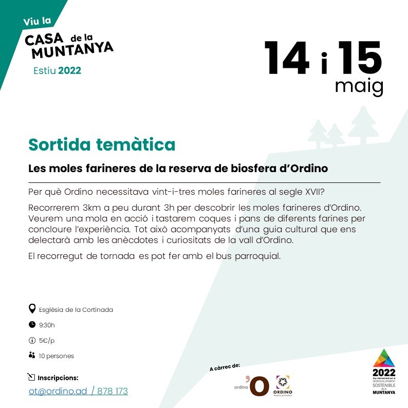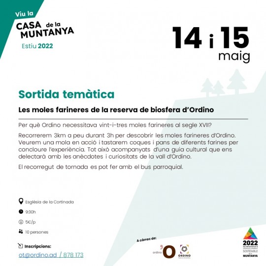 Recorregut de 3 km a peu per visitar les moles farineres d’Ordino amb una guia cultural. Es veurà treballar una mola farinera i fer un tast del pa i la coca feta amb diferents farines per arrodonir l’experiència. El recorregut de tornada es podrà fer amb bus parroquial.