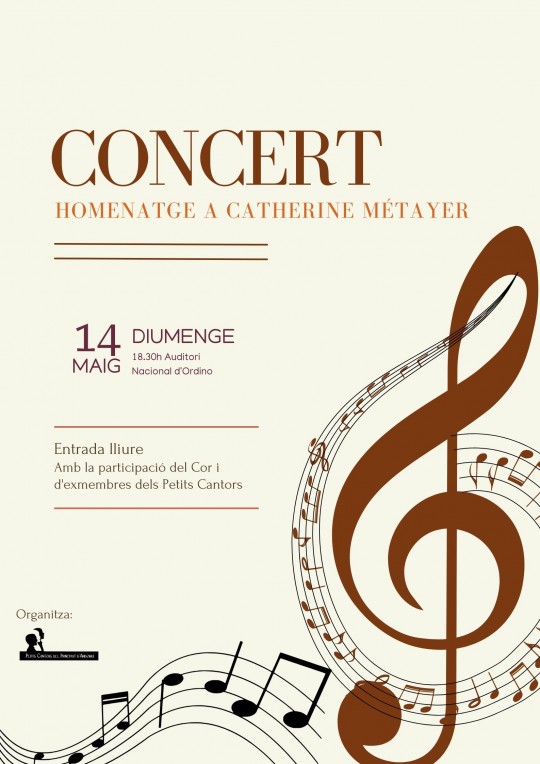 Catherine Métayer va estar al capdavant de la formació que ara dirigeix Jordi Sabata, i tant a nivell personal com al capdavant del Cor va impulsar innumerables iniciatives musicals i culturals al país i esdevé, per tant, un pilar fonamental en el desenvolupament del cant coral a Andorra. Per als Petits Cantors d’ahir, d’avui i de demà, la seva figura és cabdal i fonamental. I sense la tasca ingent que ha portat a terme durant tots aquests anys, no es podria entendre l’evolució musical del país ni tampoc l’alt grau d’estima per la música que ha aconseguit infondre en tantes i tantes generacions dels Petits cantors. És per tot això que la Junta dels Petits Cantors ha considerat fonamental poder oferir un Concert d’homenatge a la Catherine per, en la mesura del possible – sent impossible – li puguem retornar en forma d’agraïment tot el que ens ha donat durant aquests anys.