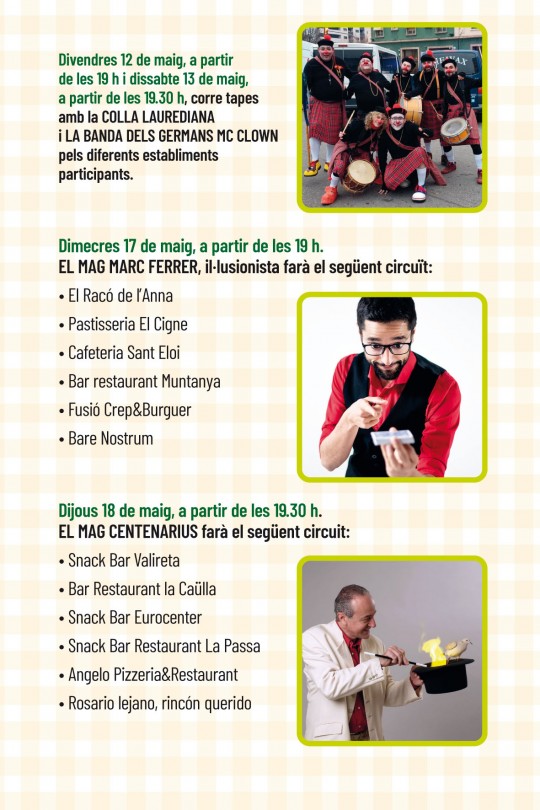Divendres 12 de maig, a partir de les 19 h, corre tapes amb la Colla Laurediana i la banda dels Germans Mc Clown pels diferents establiments participants.