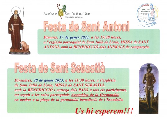 Divendres, 20 de gener, a les 11.30h, a l'església de Sant JUlià i Sant Germà, MISSA de SANT SEBASTIÀ amb la BENEDICCIÓ i entrega dela PANS a tots els participants, tot seguit a les sales parroquials Assemblea de la Germandat, en acabar a la plaça de la Germandat benedicció de l'Escudella.